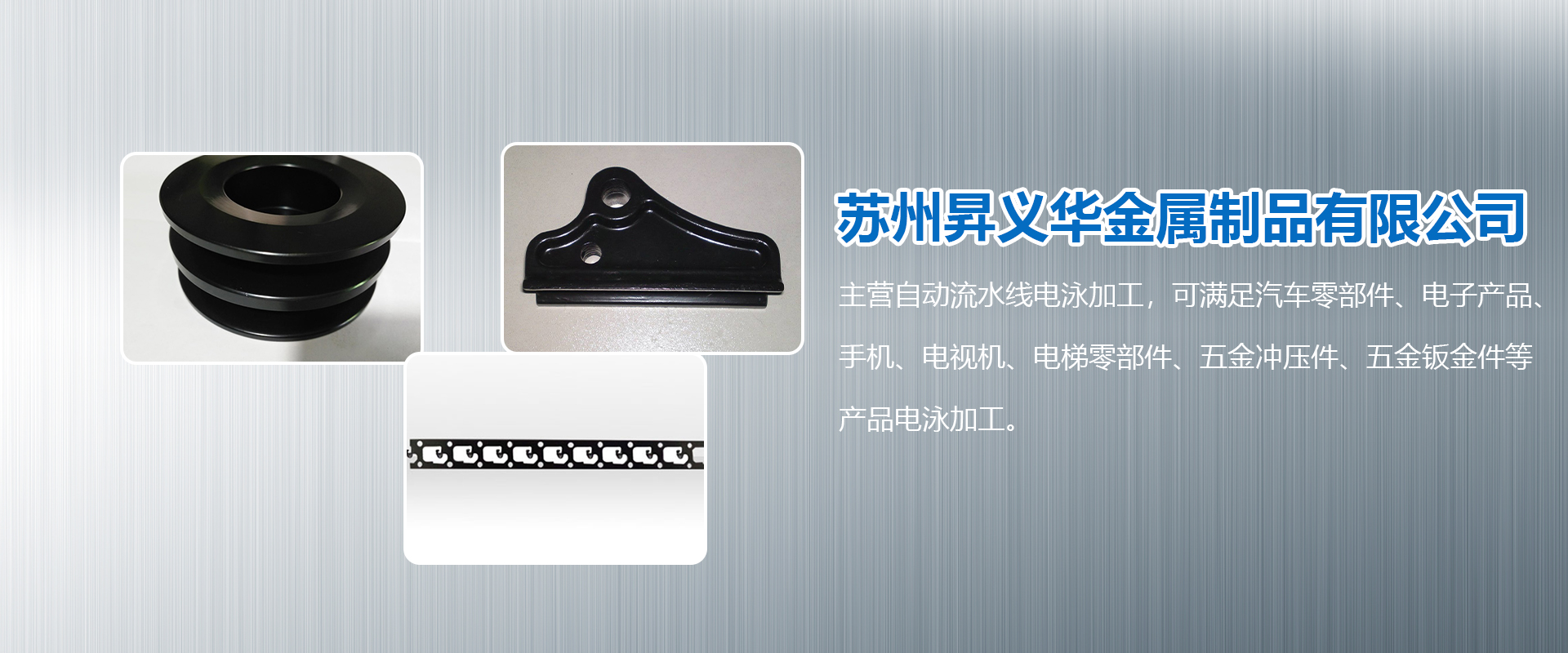 蘇州昇義華金屬制品有限公司是一家進行各類金屬表面處理專業(yè)公司。主營自動流水線電泳加工,可滿足汽車零部件、電子產(chǎn)品、手機、電視機、電梯零部件、五金沖壓件、五金鈑金件等產(chǎn)品電泳加工。
